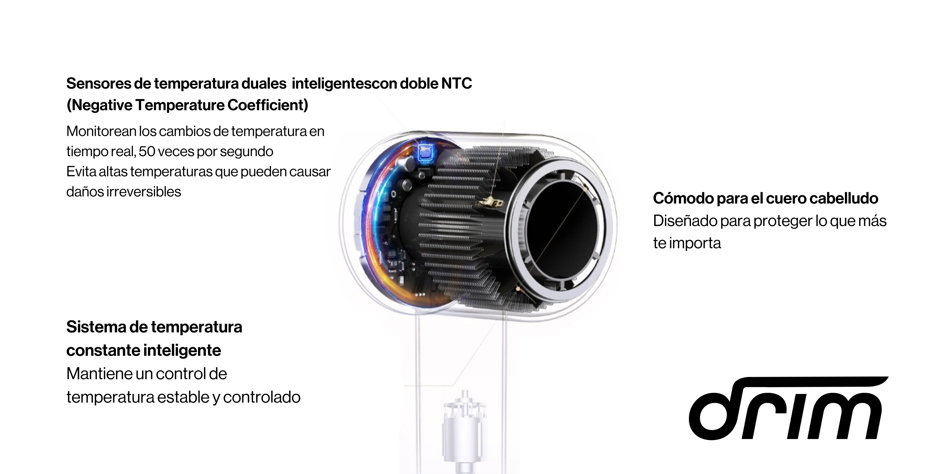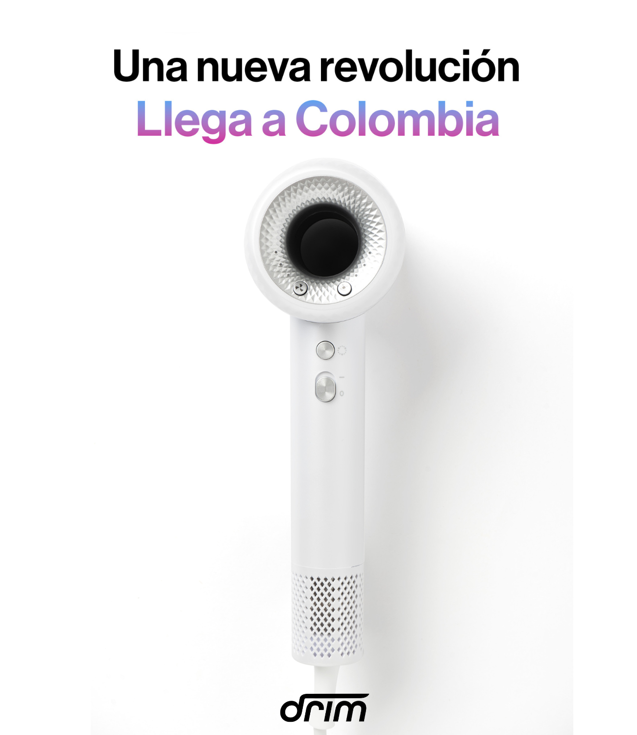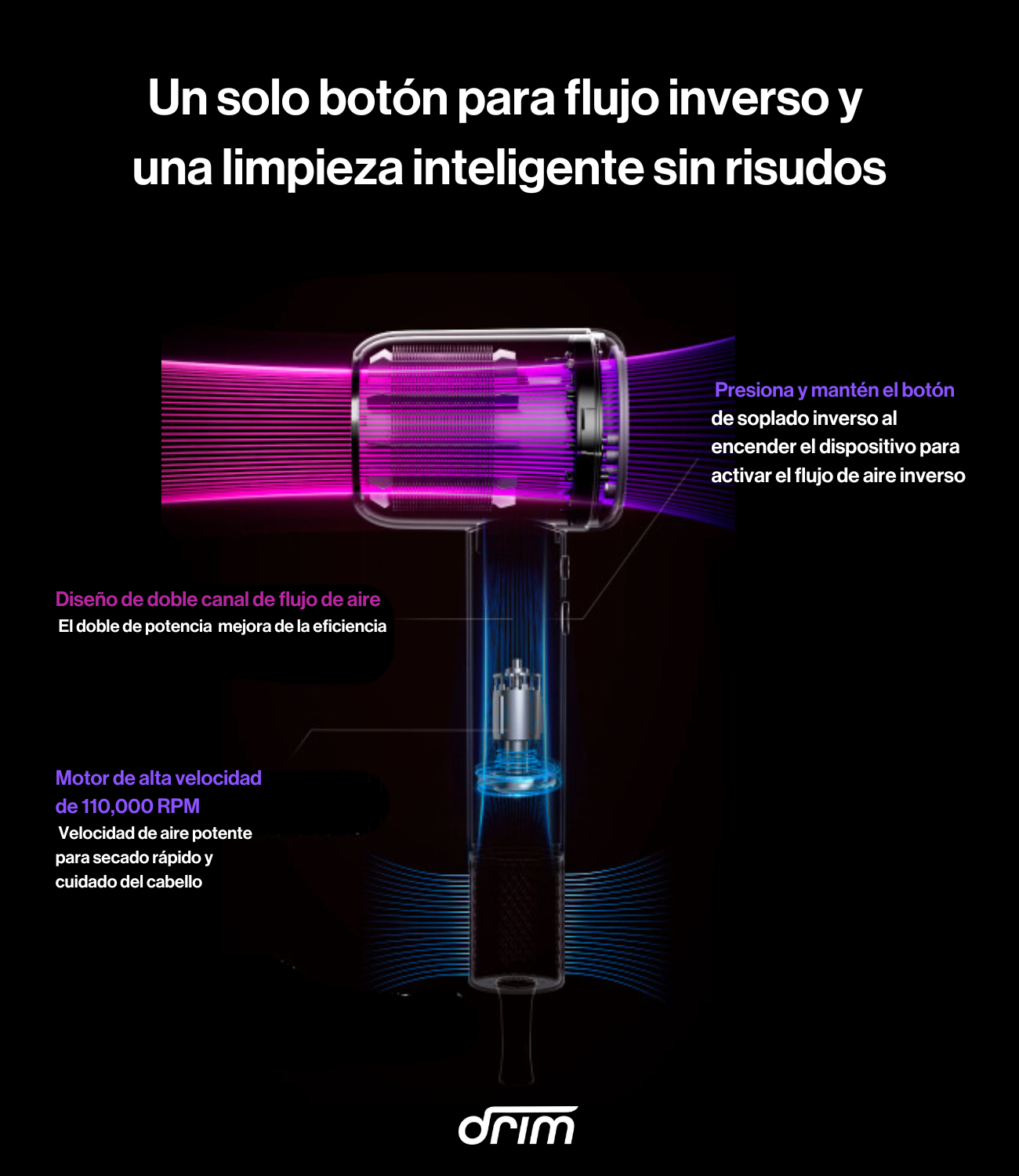 Secador supersónico Drim con ajuste automático de calor, potencia y accesorios, diseñado para potenciar el brillo natural de tu cabello y cuidar la salud del cuero cabelludo.
